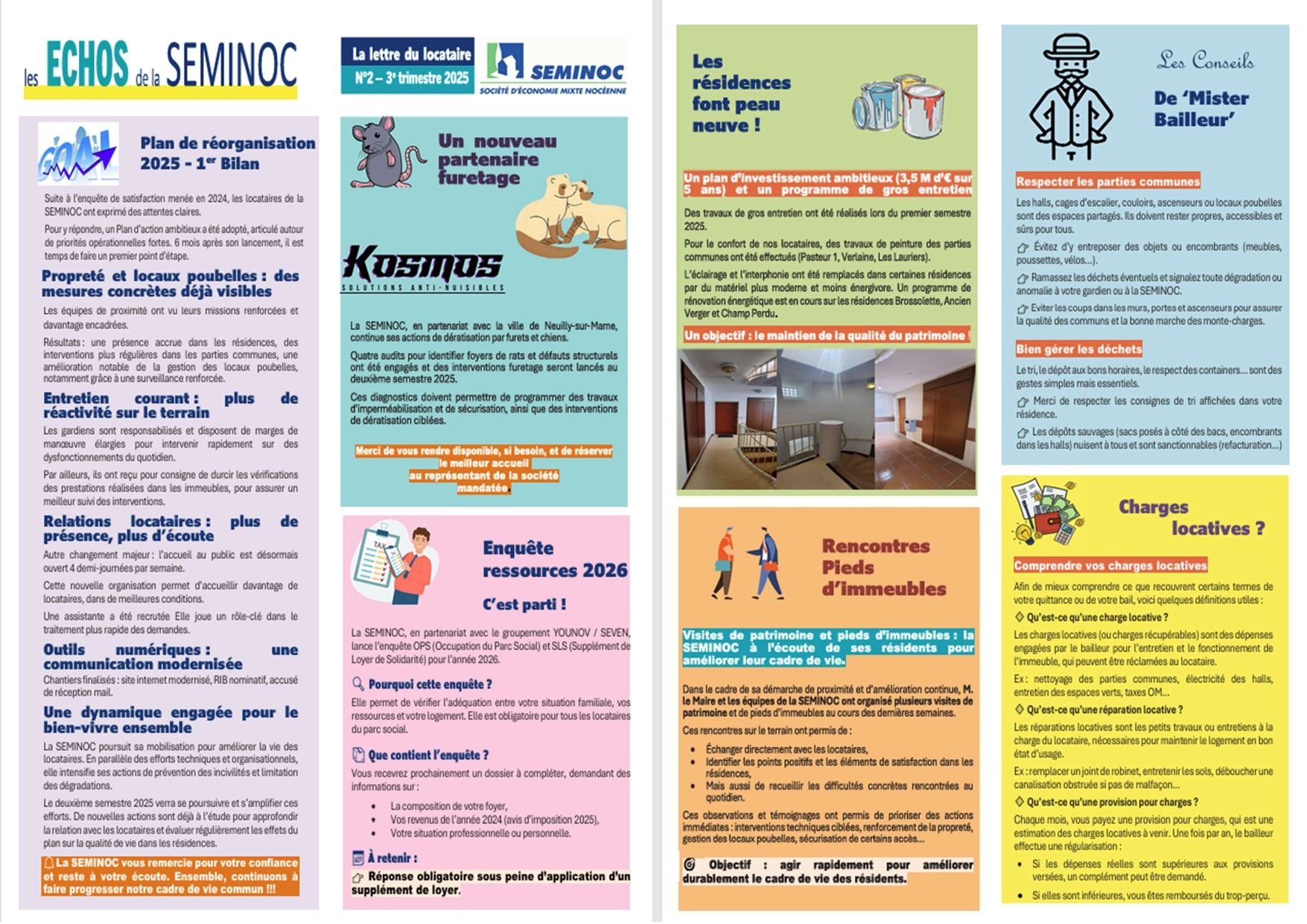 Mesdames et messieurs les locataires, Dans le cadre de notre démarche continue d'optimisation de la qualité de nos services et de nos prestations, une enquête de satisfaction a été réalisée auprès d'un panel de locataires fin 2024. Cette évaluation a permis d'identifier les points forts ainsi que les axes d'amélioration concernant nos logements et services associés. Afin d'optimiser la qualité des services proposés et d'améliorer la satisfaction des locataires, nous avons établi un plan d'action 2025 définissant une nouvelle organisation destinée à renforcer notre réactivité, notre communication avec les locataires, nos contrôles qualité des prestations, et lutter contre les incivilités et les dégradations des locaux poubelles et parties communes. Ce plan d'action définit les priorités suivantes : Renforcement de l'état de propreté des parties communes, de la gestion des poubelles et des locaux poubelles : Les missions des gardiens sont renforcées pour permettre des contrôles in situ plus efficaces, un suivi des prestations plus précis et un appui ponctuel en cas d'abus. Amélioration de l'entretien courant avec un élargissement des missions et des interventions des agents de proximité et le durcissement des vérifications des prestations opérées par les gardiens. Optimisation de la proximité des équipes de la SEMINOC avec les locataires : l'ouverture de l'accueil au public, au siège de votre bailleur, passe, à compter du 1ᵉʳ février 2025, de 2 demi-journées par semaine à 4 demi-journées par semaine (lundi, mardi, mercredi et jeudi après-midi). Développement de la relation client : création d'outils numériques permettant aux locataires de recevoir un accusé de réception par mail dès enregistrement d'une sollicitation ; modernisation du site internet pour favoriser et fluidifier l'information à destination des résidents. Les services de la SEMINOC restent à votre entière disposition pour tout questionnement supplémentaire. Veuillez agréer, Mesdames, Messieurs les locataires, l’expression de mes salutations distinguées. Zartoshte Bakhtiari